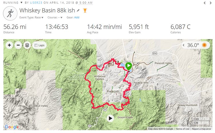 On April 14, 2018, I ran what I am considering to be my first *real* ultramarathon. True, I have previously completed a marathon with an extra couple miles, as well as a pair of 50k races, and a 51k alongside Area 51. In 2018 though, I attempted the Aravaipa Running Whiskey Basin 88k (ish) race. Turns out, it was 56.25 miles around the Prescott Circle Trail loop.